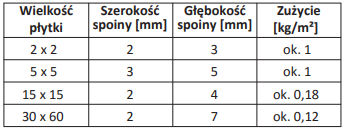 Zużycie materiału przy fugowaniu - dane podane przez producenta: