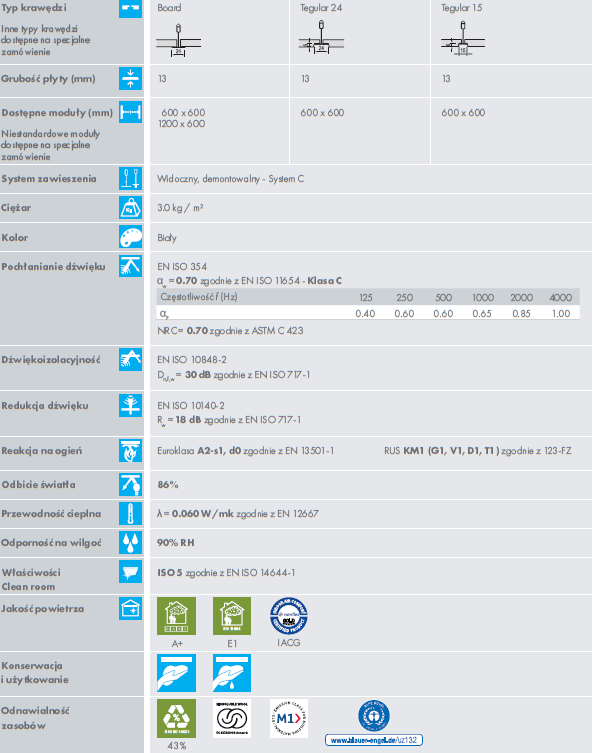 Producent proponuje płyty wykonane z mieszaniny biorozpuszczalnej wełny mineralnej nowej generacji, gliny i skrobi. Szczególnie polecane do placówek handlowych, pomieszczeń biurowych i sal konferencyjnych, pomieszczeń montażowych, hal produkcyjnych