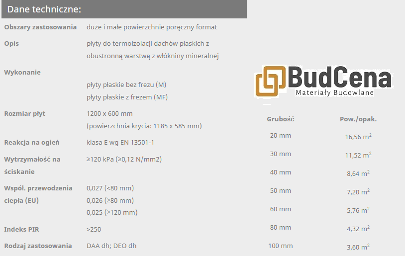 Płyta przeznaczona jest do dachu płaskiego, świetnie radzi sobie z ochroną dachu przed utratą ciepła, ponad to odznacza się stabilnością wymiarową oraz wysoką wytrzymałością termiczną. Przedstawiony produkt jest odporny na pleśń, nie wydziela nieprzyjemnych zapachów i nie ulega rozkładowi, a wszystko to powoduje, że jest bezpieczny dla zdrowia.