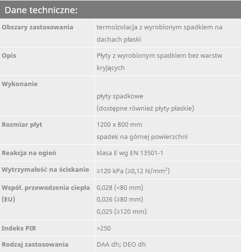 Płyta przeznaczona jest do dachu płaskiego, świetnie radzi sobie z ochroną dachu przed utratą ciepła, ponad to odznacza się stabilnością wymiarową oraz wysoką wytrzymałością termiczną. Przedstawiony produkt jest odporny na pleśń, nie wydziela nieprzyjemnych zapachów i nie ulega rozkładowi, a wszystko to powoduje, że jest bezpieczny dla zdrowia.