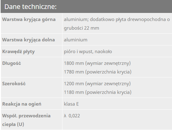Produkt ciekawy, posiada na wierzchniej warstwie płytę OSB o grubości 22 mm, natomiast jego rdzeń izolacyjny to sztywna pianka poliuretanowa (PIR); λ 0,022. Super produkt.
