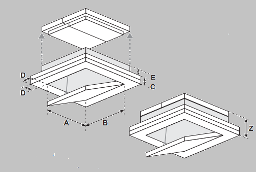 Wymiar D jest niezmienny. Wymiar C może mieć od 40 do 50mm. Wymiar E zmienia się zależnie od zastosowanej płyty. Całkowita wysokość Z wynosi 110mm.